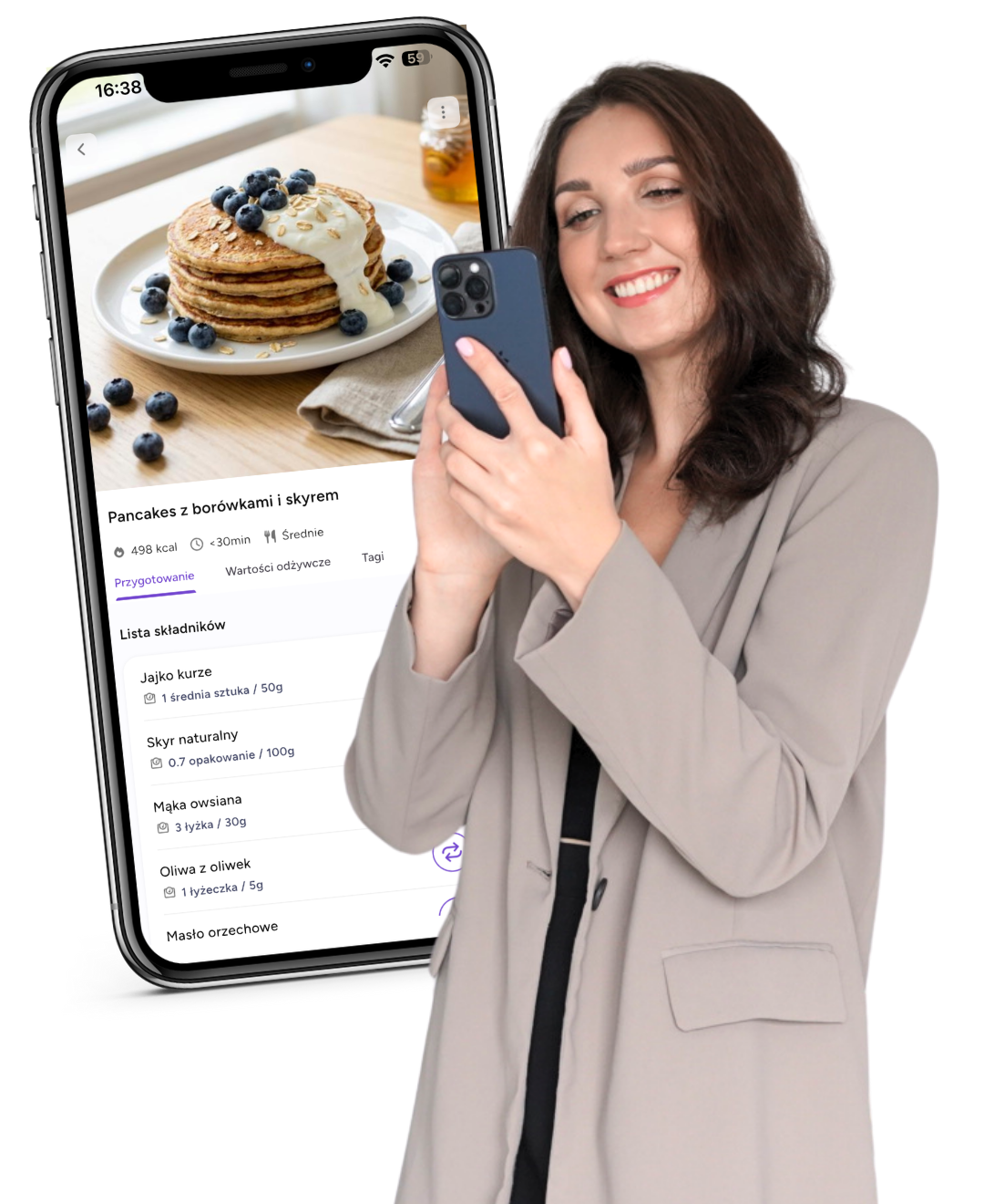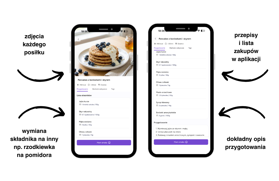 Dzięki aplikacji będziesz mieć jadłospis zawsze pod ręką, tak samo jak i listę zakupów, która generuje się automatycznie (wg ilości dni, które zaznaczysz). Wszystkie posiłki mają zdjęcia, dokładną gramaturę i opis przygotowania, a poszczególne składniki możesz wymieniać na inne (np. pomidora na ogórka, kaszę na makaron, rukolę na roszponkę itd. – aplikacja podpowiada nawet jaki produkt będzie podobny kalorycznie).